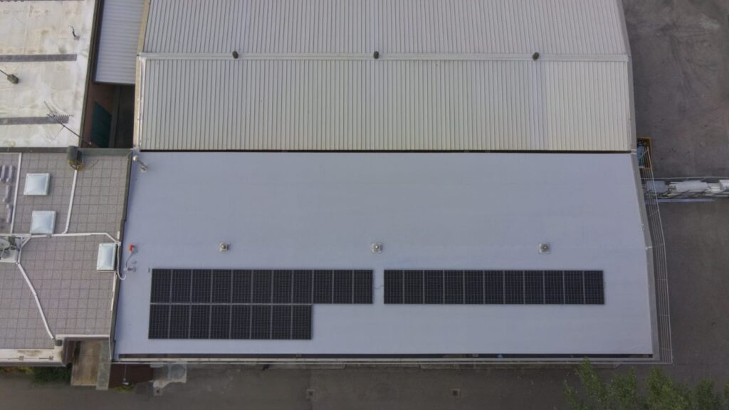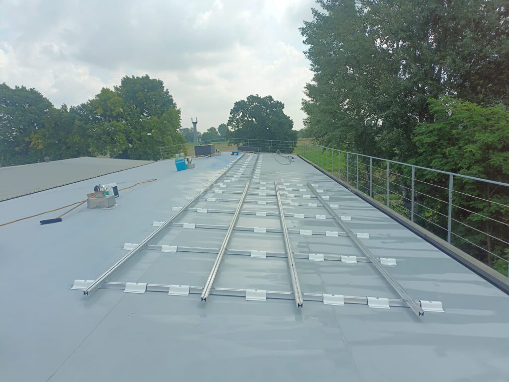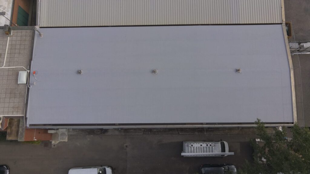 Tetto di supporto in lamiera grecata, reso piano con elemento di compensazione in polistirene e impermeabilizzato con manto sintetico in TPO